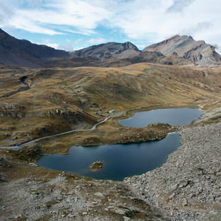 Da wir uns nach dem Schauer vom heiligen Sankt Bernhard höchstpersönlich geläutert genug fühlten, hatten wir die Sonne redlich verdient und freuten uns auf den versteckten Colle de Nivolet. Wolf hatte diesen vor einigen Jahren schon einmal aufgesucht und freute sich auf das Wiedersehen. (Ich meinte unterwegs sogar ihn unter seinem Helm vor Freude heulen zu hören - so wie nur echte Wölfe es können.) Kennzeichnend sind die beiden Seen zum Fuße des Nivolet.